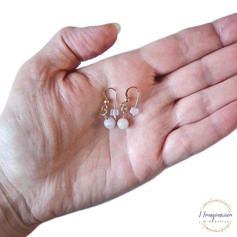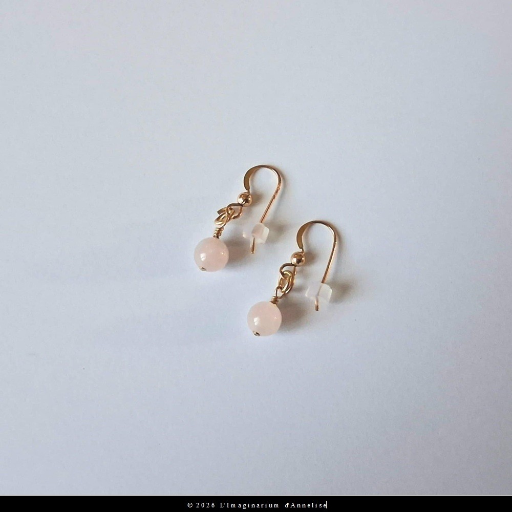 Voici Amantine, une paire de boucles d'oreilles en plaqué or 14 carats et pierre naturelle rose 6 mm : quartz rose. très légères.
