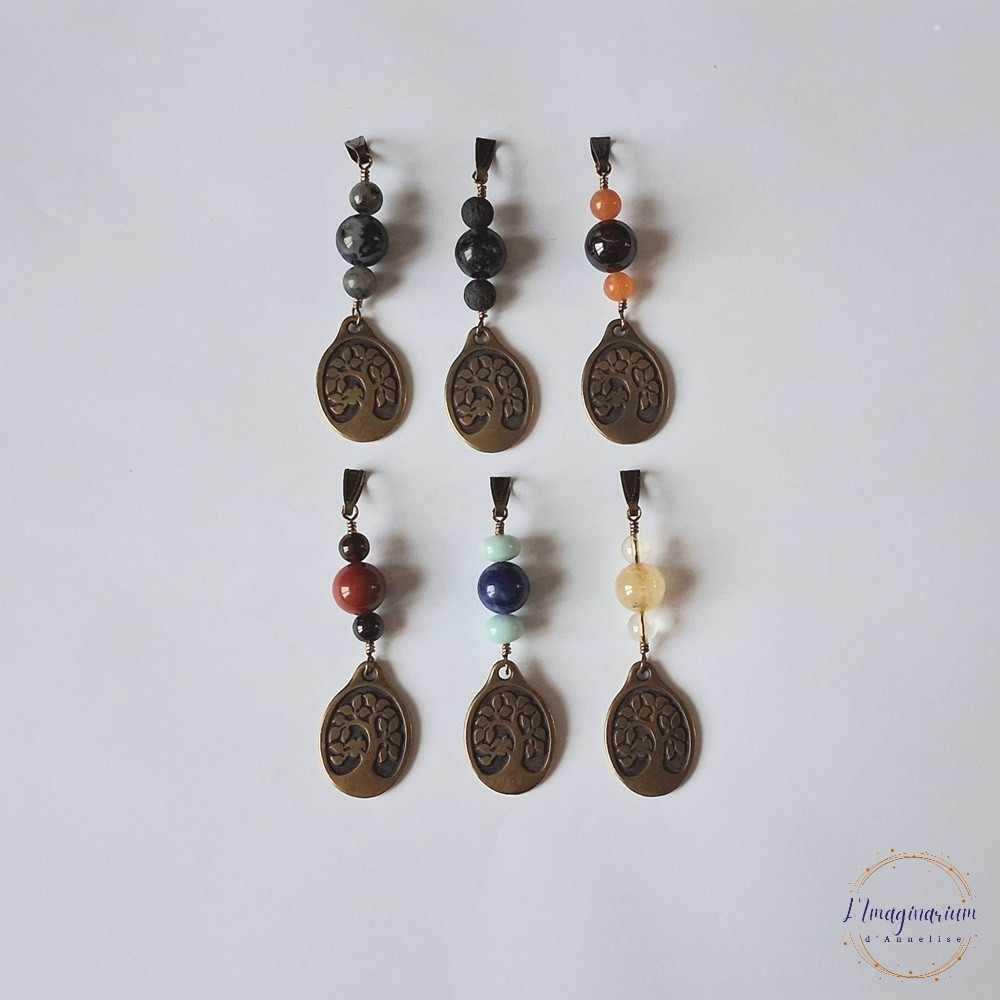Voici Oshin, une jolie collection de 6 pendentifs unisexes en métal couleur bronze avec pierres naturelles 6 mm et 10 mm noires, grises, rouges, oranges, bleues, jaunes.