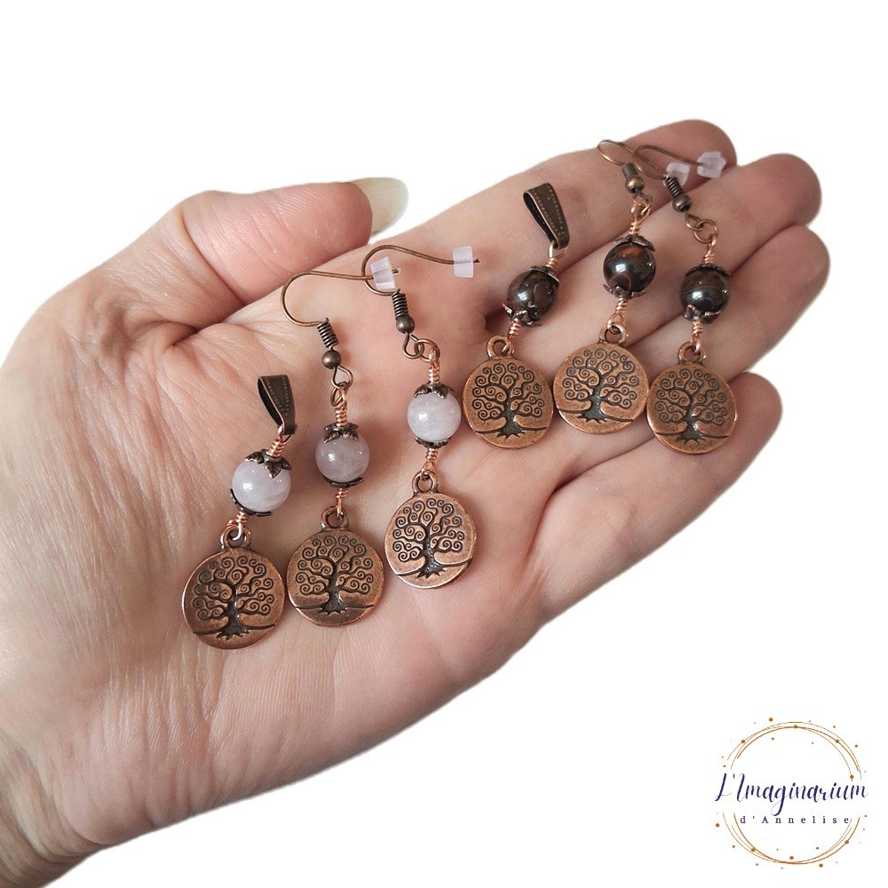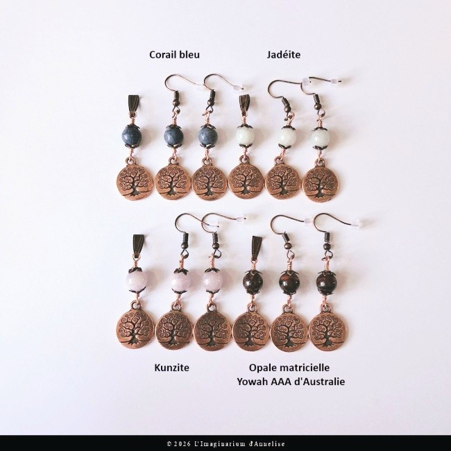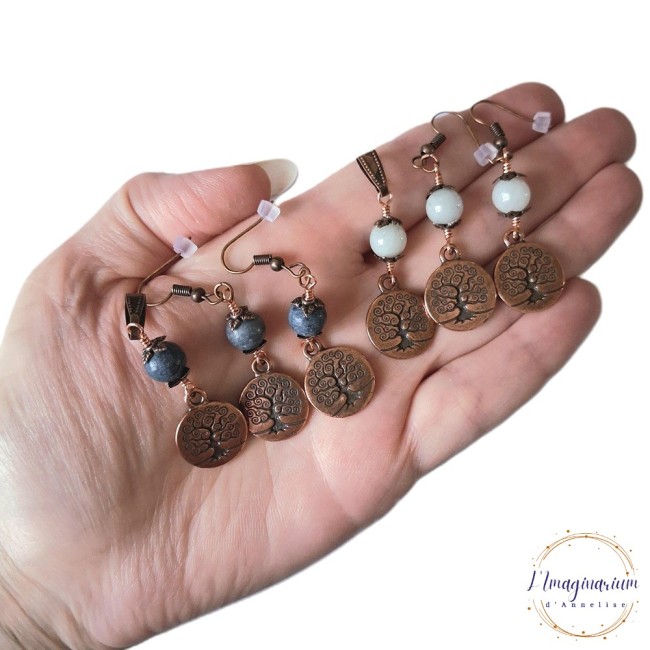 Voici Aelys, une jolie collection de 4 parures en métal cuivré avec pierres naturelles 8 mm bleues, vertes clair, roses et marrons. Chaque parure est composée d'un pendentif et une paire de boucles d'oreilles avec de jolies breloques arbre de vie.